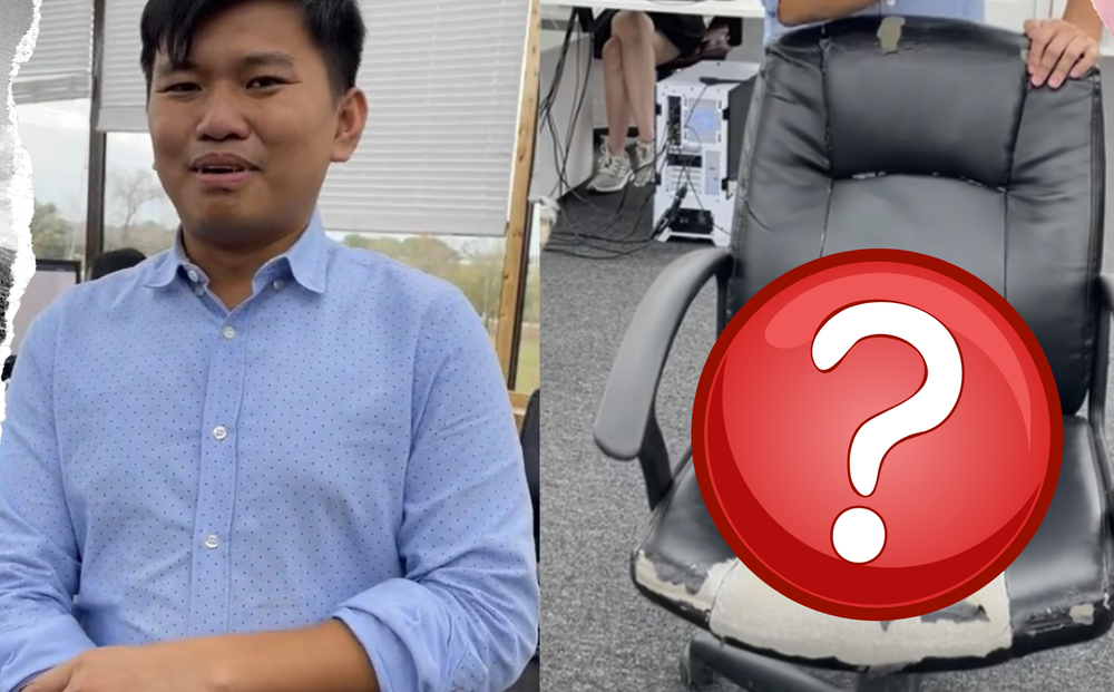 Tuy nhiên, chi tiết đặc biệt khiến nhiều fan phải thốt lên kinh ngạc đó là chiếc ghế ngồi trong công ty lại vô cùng... rách nát. Vương Phạm cho biết, công ty anh thường dùng những chiếc ghế này đến sờn rách rồi mới bóc đi thay da mới.