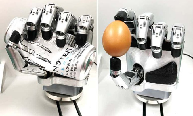 Chuyên gia Uikyum Kim tại Đại học Ajou cùng các đồng nghiệp chế tạo bàn tay robot giống tay người với các đầu ngón tay gắn cảm biến chạm, New Scientist hôm 14/12 đưa tin. Thiết bị mới đủ mạnh để bóp nát lon nước bằng nhôm, đồng thời cũng đủ khéo léo để cầm một quả trứng.
