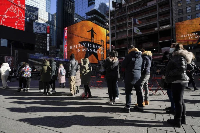 Người dân đang xếp hàng dài trước Quảng trường Thời đại, New York, để xét nghiệm Covid-19.