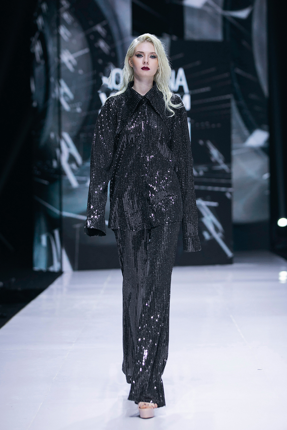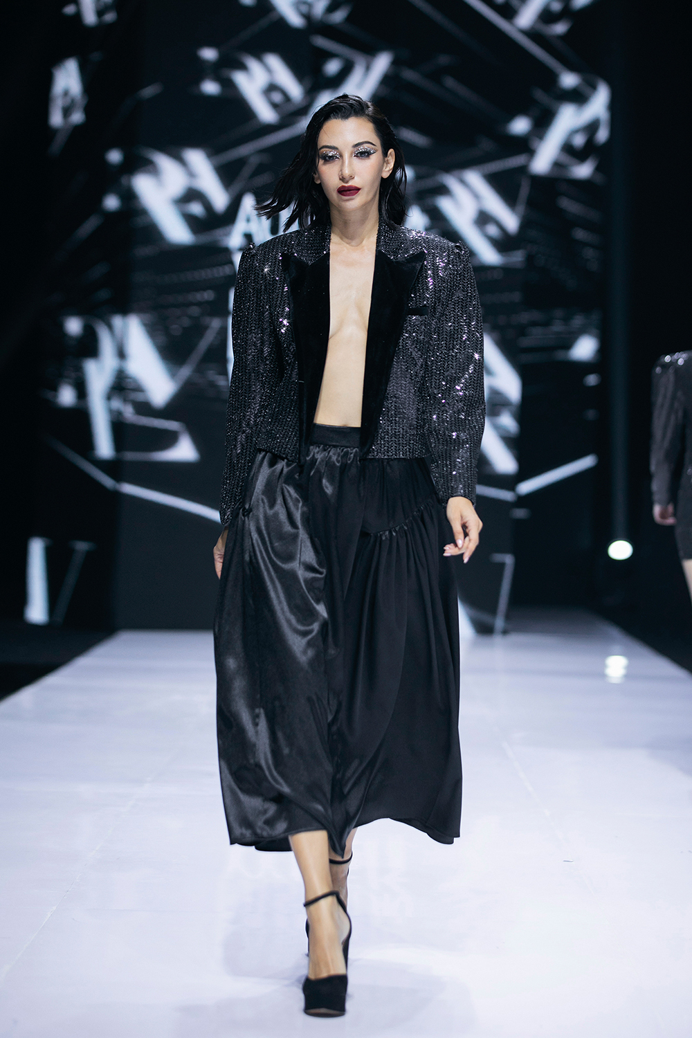 Trên bảng màu đen và trắng kinh điển, Devon Nguyễn khai thác chất liệu sequin, tweed, satin... Nếu phần đầu, show đem tới những mẫu áo khoác cơ bản, nửa sau của bộ sưu tập là sân chơi của những thiết kế phá cách, phô trương đường cắt, cấu trúc, phù hợp với những buổi tiệc.