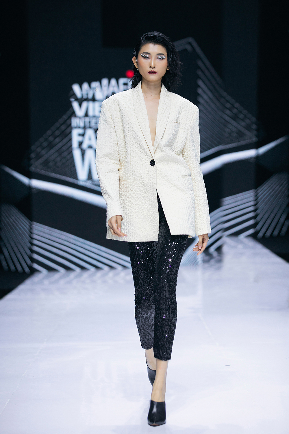 Người mẫu Kim Nhung sải bước với blazer quá khổ màu trắng, kết hợp quần sequin bó sát và giày mule.