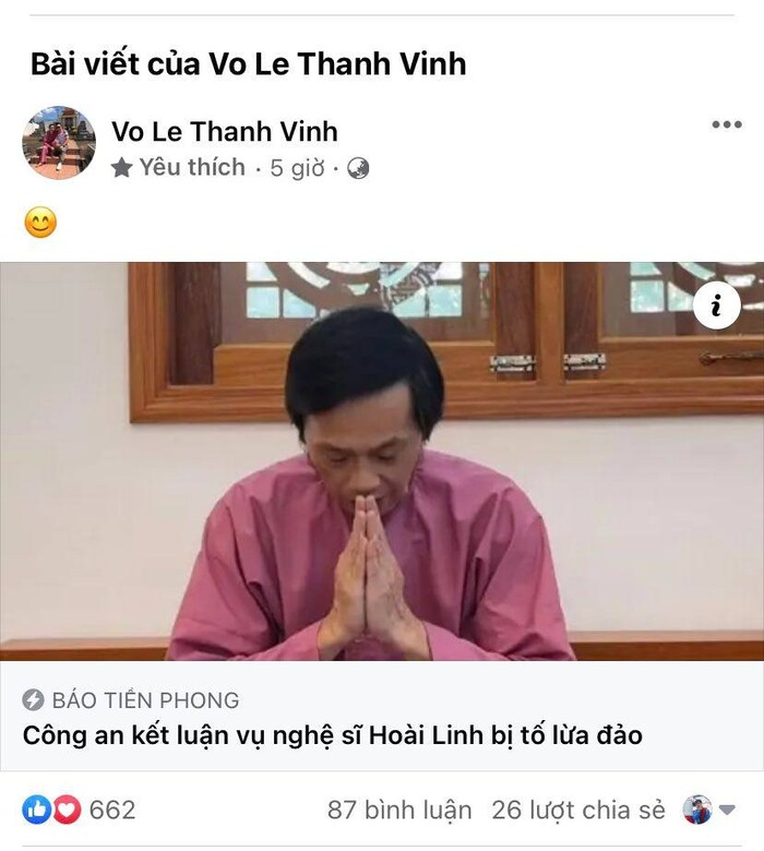 Ngay lập tức chiều 22/12 nhiều sao Việt đã có chia sẻ lên Facebook thể hiện ý kiến cá nhân. Đầu tiên là Võ Lê Thành Vinh, con trai của Hoài Linh đã liên tục chia sẻ các bài viết về việc Hoài Linh không bị khởi tố kèm theo icon mặt cười. Tuy không có bất kỳ dòng chia sẻ nào nhưng với động thái này có thể thấy Thành Vinh rất vui mừng.