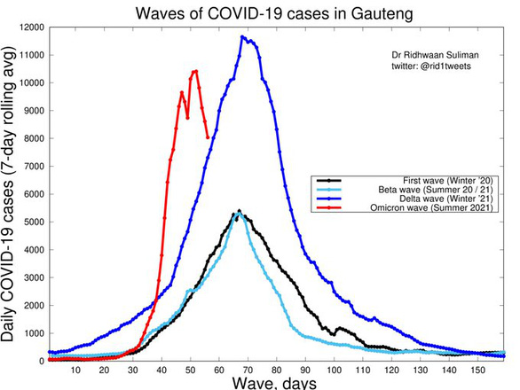Đồ thị diễn biến của 4 làn sóng Covid-19 ở tỉnh Gauteng, tâm dịch của Nam Phi, trong đó đường màu đỏ là diễn biến của làn sóng Omicron. Ảnh: RIDHWAAN SULIMAN