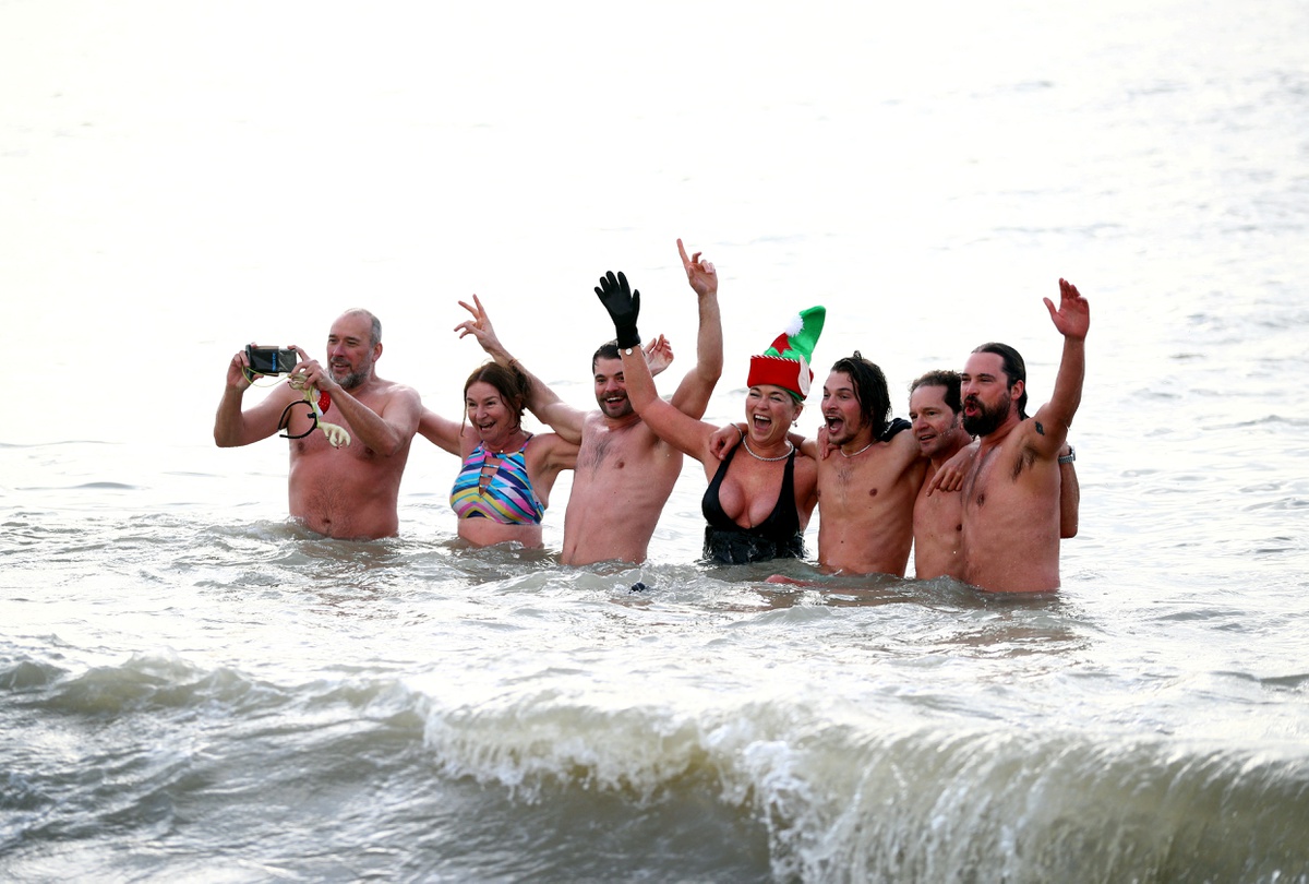 Vào tháng 12, nhiệt độ nước biển ở Anh dao động quanh mức 10 độ C. Dù vậy, thời tiết lạnh giá không thể ngăn rất nhiều người tham gia cùng người thân và bạn bè.