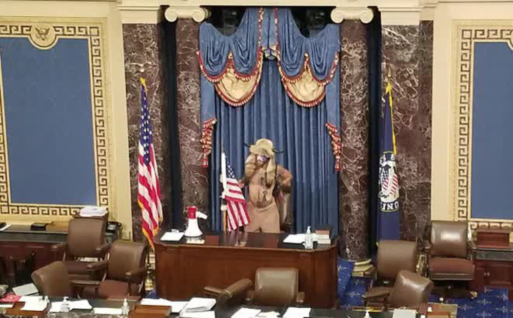 Jacob Anthony Chansley tạo dáng tại phòng họp của Thượng viện Mỹ hôm 6-1. Ảnh: Twitter