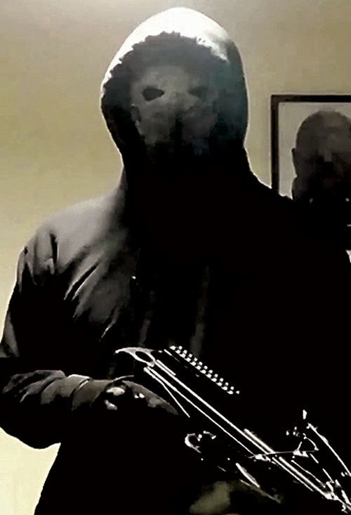 Chân dung kẻ đột nhập với trang phục như trong phim 'Chiến tranh giữa các vì sao' và cầm nỏ trên tay. Ảnh: The Sun