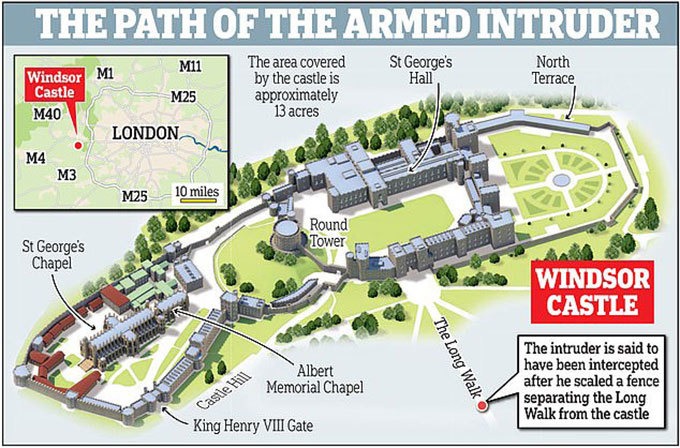 Các nhân viên an ninh lâu đài Windsor phát hiện một thanh niên cầm vũ khí cố vượt qua hàng rào vào nơi ở của Nữ hoàng Anh hôm 25/12.