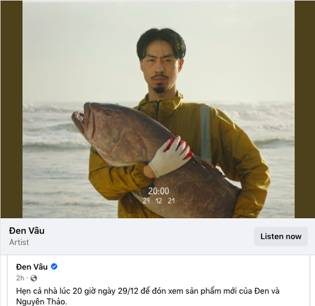 Trong Fanpage Đen Vâu bất ngờ thông báo sẽ lên sóng sản phẩm mới. Đi kèm với đó là bức ảnh “chơi trội” đập ngay vào mắt fan: Đen Vâu đang ôm một con cá khổng lồ! Chưa rõ nội dung sản phẩm nhưng nhiều netizen đã đoán ngầm có liên quan đến biển khơi, hải sản đồ…
