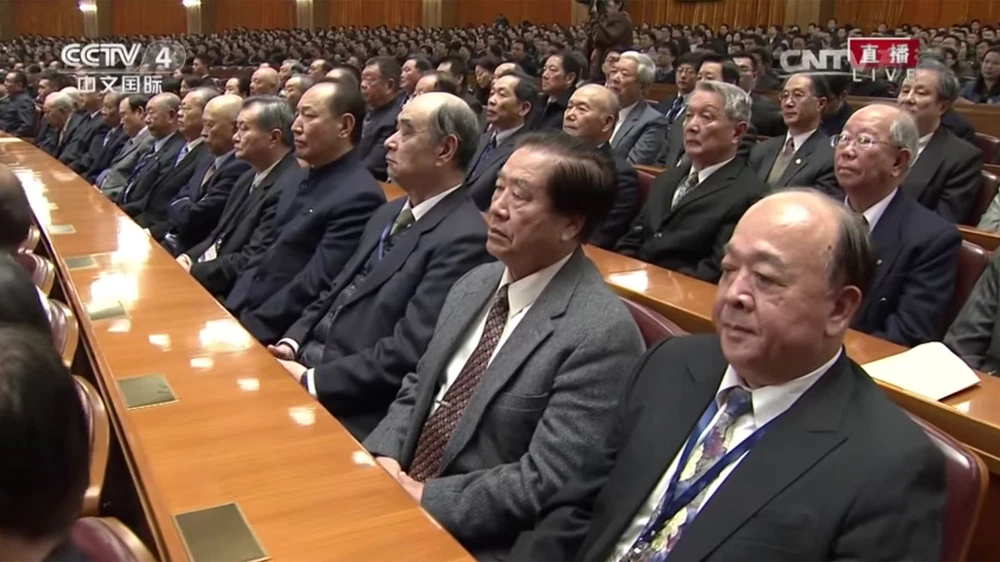 Vào năm 2016, một nhóm các tướng lĩnh Đài Loan đã nghỉ hưu được nhìn thấy trên truyền hình nhà nước Trung Quốc khi họ tham dự một bài phát biểu của Chủ tịch Tập Cận Bình tại Đại lễ đường Nhân dân ở Bắc Kinh. Ảnh CCTV