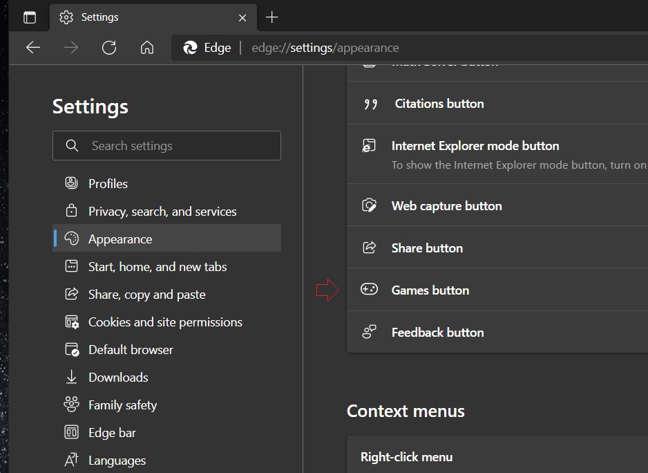 Một số người dùng phiên bản Edge Canary đă phát hiện có mục Appearance mới là Games Button, mà khi click vào bạn sẽ thêm một panel Games vào thanh omnibar, kế bên thanh địa chỉ.