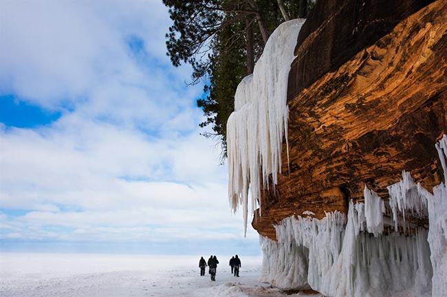 Động băng ở bờ hồ quốc gia quần đảo Apostle, Wisconsin: Nơi đây có muôn vàn kỳ quan thiên nhiên, từ những khối đá cheo leo, vách đá chắn gió cho đến những băi cát dài... Nhưng không nơi nào hấp dẫn bằng những hang động băng h́nh thành ở đây vào mỗi mùa đông.