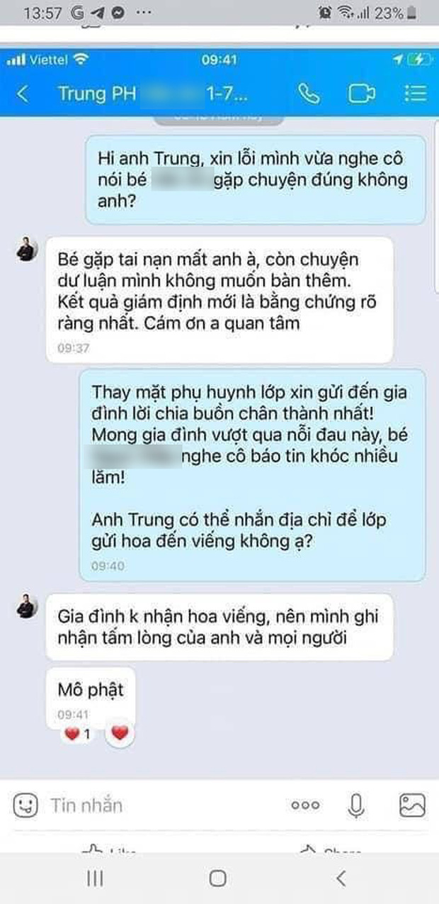 Mới đây, trên mạng xã hội xuất hiện một đoạn tin nhắn được cho là của Nguyễn Kim Trung Thái khi một phụ huynh trong lớp học của bé V.A hỏi thăm. Theo đoạn tin nhắn này, phụ huynh biết bé V.A gặp chuyện nên đã nhắn tin cho Thái để chia buồn với gia đình.