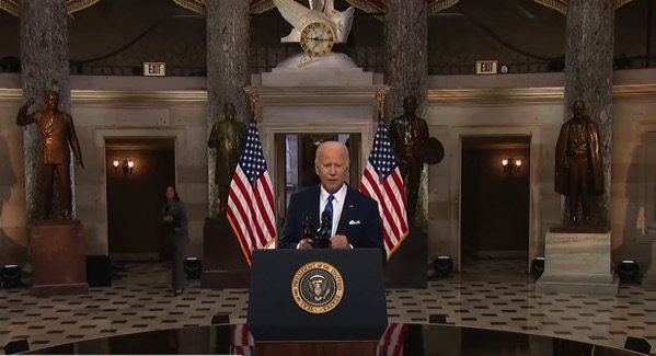 Ngày này một năm trước, ở nơi thiêng liêng này, nền dân chủ bị tấn công, nói thẳng là bị tấn công. Ý chí của dân chúng đã bị tấn công. Hiến pháp - Hiến pháp của chúng ta - đối mặt những mối đe dọa nghiêm trọng nhất. Bị áp đảo trong một vụ tấn công tàn bạo, những người cảnh sát điện Quốc hội, Sở cảnh sát Thủ đô, Vệ binh Quốc gia, và nhiều sĩ quan công lực dũng cảm khác, đã cứu lấy nền pháp quyền.