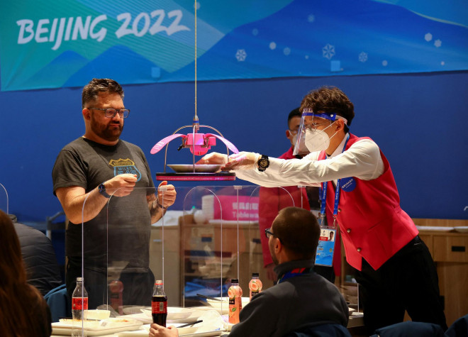 Các nhà báo nhận bữa trưa do máy nấu ăn chuyển tới tại Trung tâm Báo chí chính của Thế vận hội mùa đông ở Bắc Kinh hôm 6-1. Ảnh: REUTERS