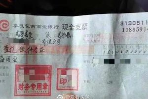 Một cụ bà ở tỉnh Tứ Xuyên (Tây Nam Trung Quốc) đã không tin vào mắt mình khi nhặt được tấm séc trị giá 150 triệu nhân dân tệ (tương đương hơn 536 tỷ đồng) trên phố.Báo giới Trung Quốc hôm 14/1 đưa tin cảnh sát huyện Mễ Dịch (tỉnh Tứ Xuyên) đã nhận được tin trình báo của một cụ bà về việc nhặt được tấm séc có số tiền cực “khủng”.