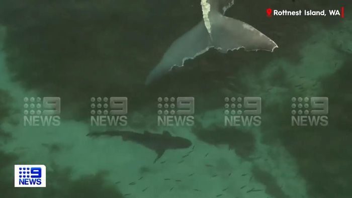 Một con cá mập điên cuồng ăn mồi được phát hiện đang ăn thịt cá voi ngoài khơi đảo Rottnest của vùng biển Tây Úc.