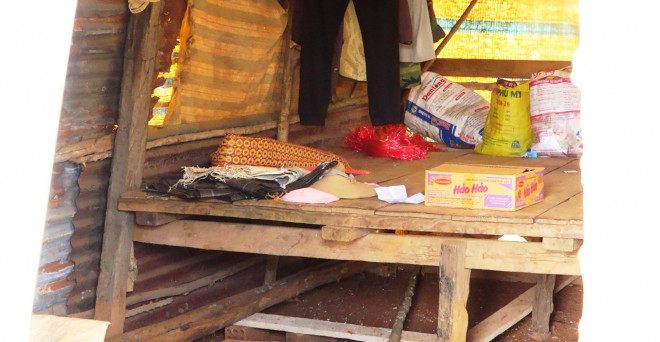 Bên trong căn chòi bị lục lọi xáo trộn và còn lại vết máu dưới nền đất