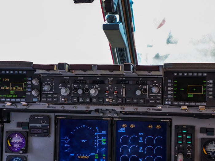 Buồng lái của C-17 ở tầng trên của máy bay, phía trên khoang chở hàng. Và khoang lái cũng thiếu thẩm mỹ tương tự như khoang chở hàng.
