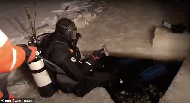 Một người đàn ông 50 tuổi, dường như chồng người phụ nữ, nhảy xuống hố băng nhưng không tìm thấy vợ.