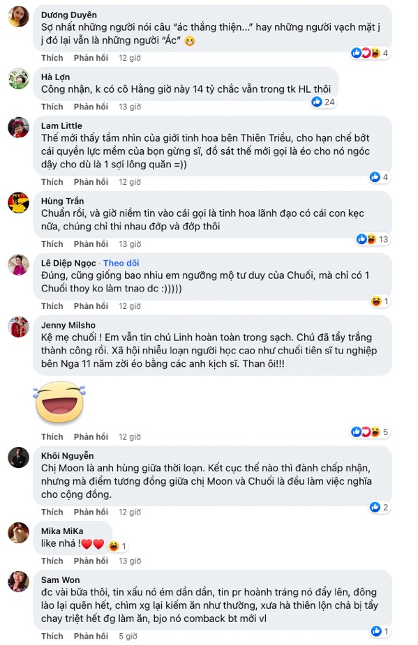 Nhiều người không hiểu não họ nghĩ gì Đám nghệ sĩ thì cống hiến được gì mà suốt ngày mở miệng nói cống hiến cho nền văn hóa nước nhà. Họ diễn thì bán vé thu tiền, ai nói trái ý thì chửi thẳng mặt khán giả, sống xa hoa là nhờ khán giả mà miệng bảo khán giả không nuôi sống họ. Trong khi Cô Hằng cống hiến tiền của cho hoạt động thiện nguyện, cho xã hội thì tụi báo chí, nghệ sĩ và tụi lươn dập không thương tiếc. Cô Hằng lên tiếng được lợi lộc gì cho cô ấy hay nhờ Cô mà mọi người mới sáng mắt ra là trên đời không có "thần y" nào chữa được bệnh bằng cách "đập" bệnh nhân, không có chuyện đã đứng ra kêu gọi từ thiện mà không công khai minh bạch, không thể nào ôm tiền cứu trợ lũ lụt mà ngâm 6 tháng trời đến khô ráo, bị tố mới đem ra giải ngân. Không hiểu kết quả này là thế nào nhưng chưa bao giờ tin đám nghệ sĩ giả tạo.