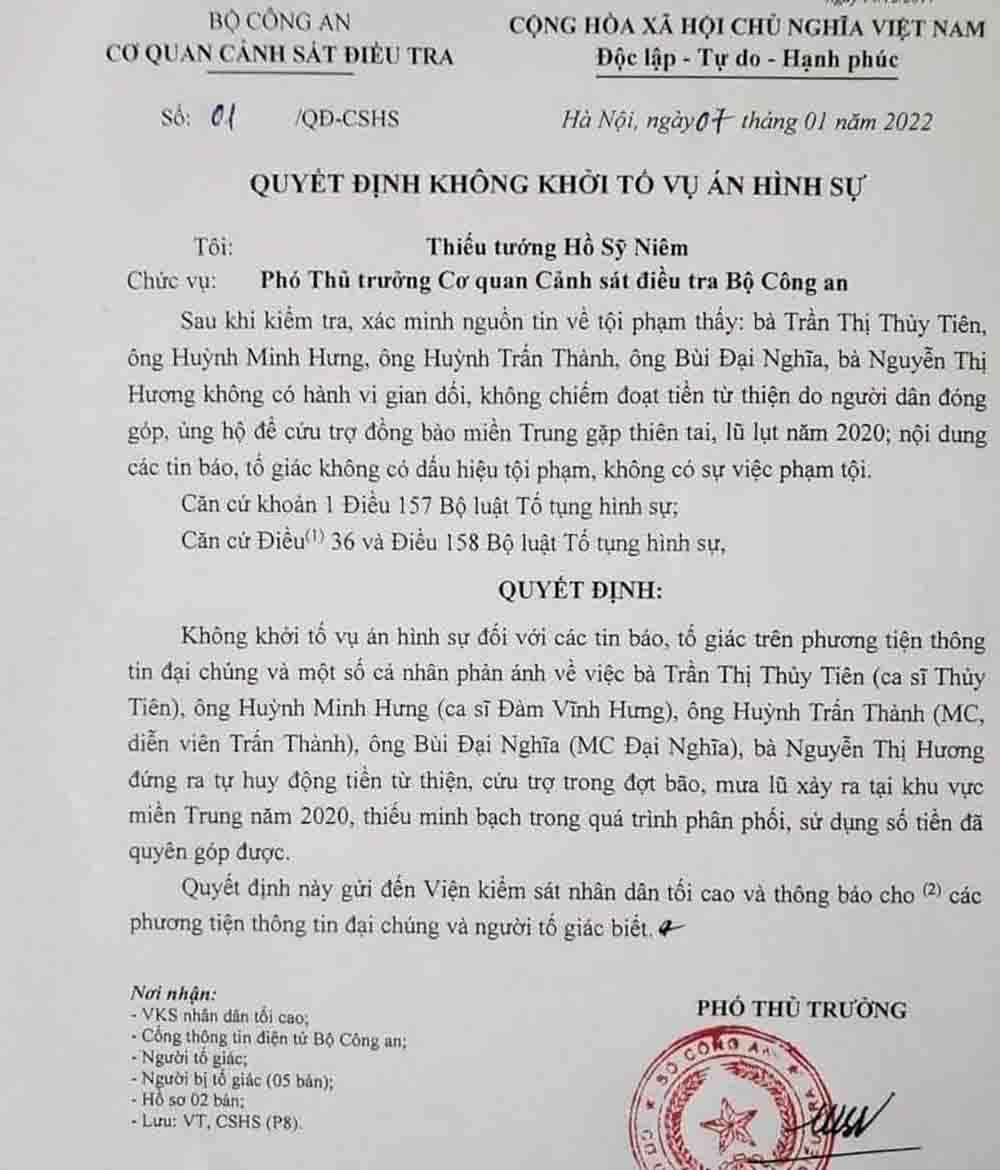 Không lâu sau đó, cơ quan CSĐT Công an TPHCM và Bộ Công an cũng lần lượt có thông báo và quyết định không khởi tố vụ án hình sự đối với tố giác nhắm tới một số nghệ sĩ, cá nhân như: Nguyễn Võ Hoài Linh (danh hài Hoài Linh) Trần Thị Thuỷ Tiên (ca sĩ Thuỷ Tiên), Huỳnh Minh Hưng (ca sĩ Đàm Vĩnh Hưng), Huỳnh Trấn Thành (ca sĩ Trấn Thành), Bùi Đại Nghĩa (MC Đại Nghĩa) và bà Nguyễn Thị Hương (mẹ của Hồ Ngọc Hà) trong vấn đề từ thiện. Cơ quan công an cho rằng, những người này không có hành vi gian dối, không chiếm đoạt tiền từ thiện do người dân đóng góp, ủng hộ.