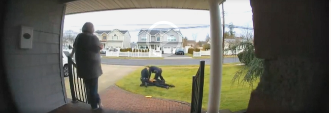 Camera trên cửa nhà bà Jean ghi lại cảnh nghi phạm bị bắt. Video: Nassau County PD