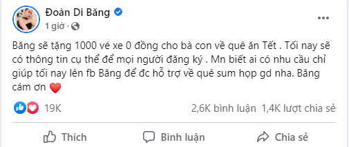 Đoàn Di Băng đã thông báo sẽ tặng 1.000 vé xe 0 đồng tặng bà con về quê ăn Tết. Mục đích của Đoàn Di Băng là hỗ trợ những người đi làm xa có điều kiện về quê sum họp, đoàn viên bên gia đình. Đoàn Di Băng cho biết, cô đã liên hệ được tuyến xe các tỉnh miền Tây và Nam Trung Bộ.