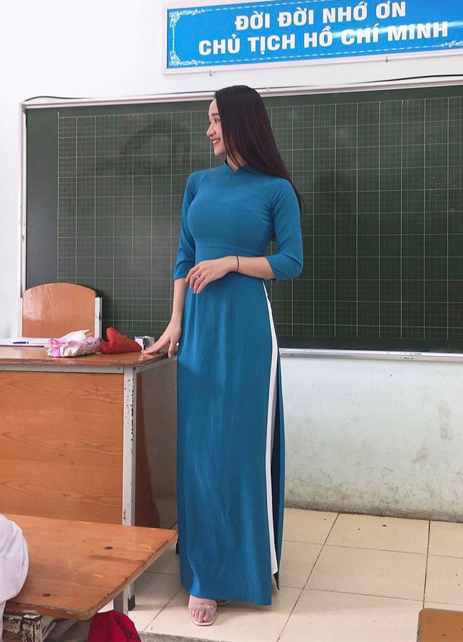 Trái với phong cách quyến rũ ngoài đời, khi đứng trên bục giảng, cô nàng thường mặc áo dài, trang phục công sở kín đáo.