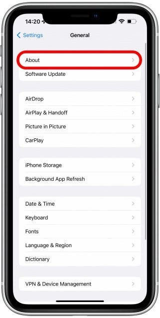 Trước hết người dùng iPhone vào mục Settings => General => About.