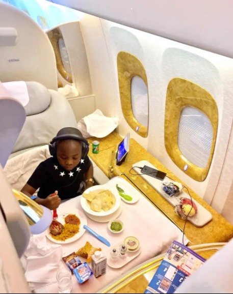 Trong một chia sẻ mới đây, có thể thấy vị "thiếu gia nhí" ăn vận sành điệu khi đứng cạnh chiếc siêu xe Bentley Flying Spur màu kem của mình. Một bức ảnh khác cho thấy cậu ta đang dùng bữa bên trong một chiếc máy bay riêng.