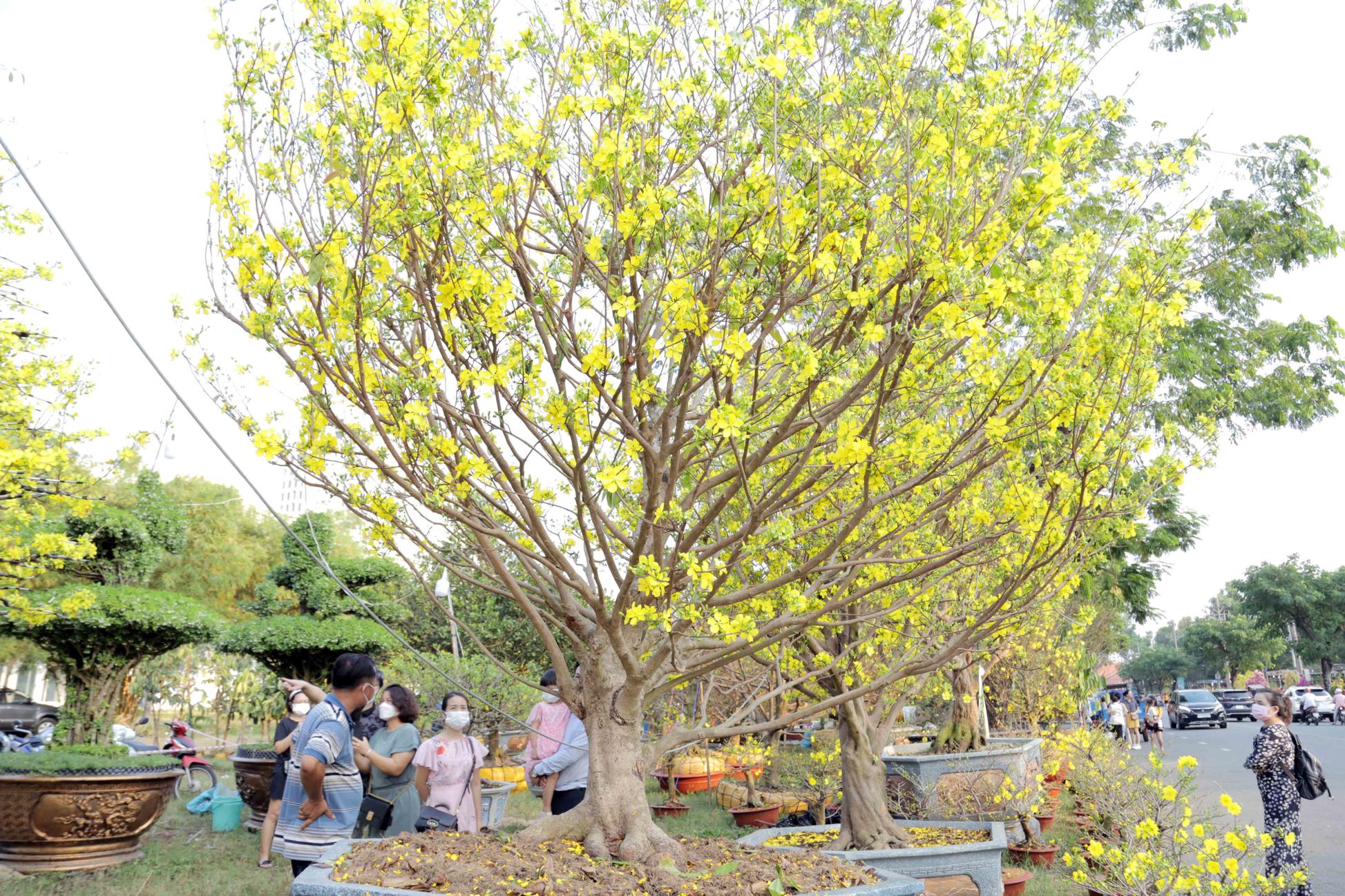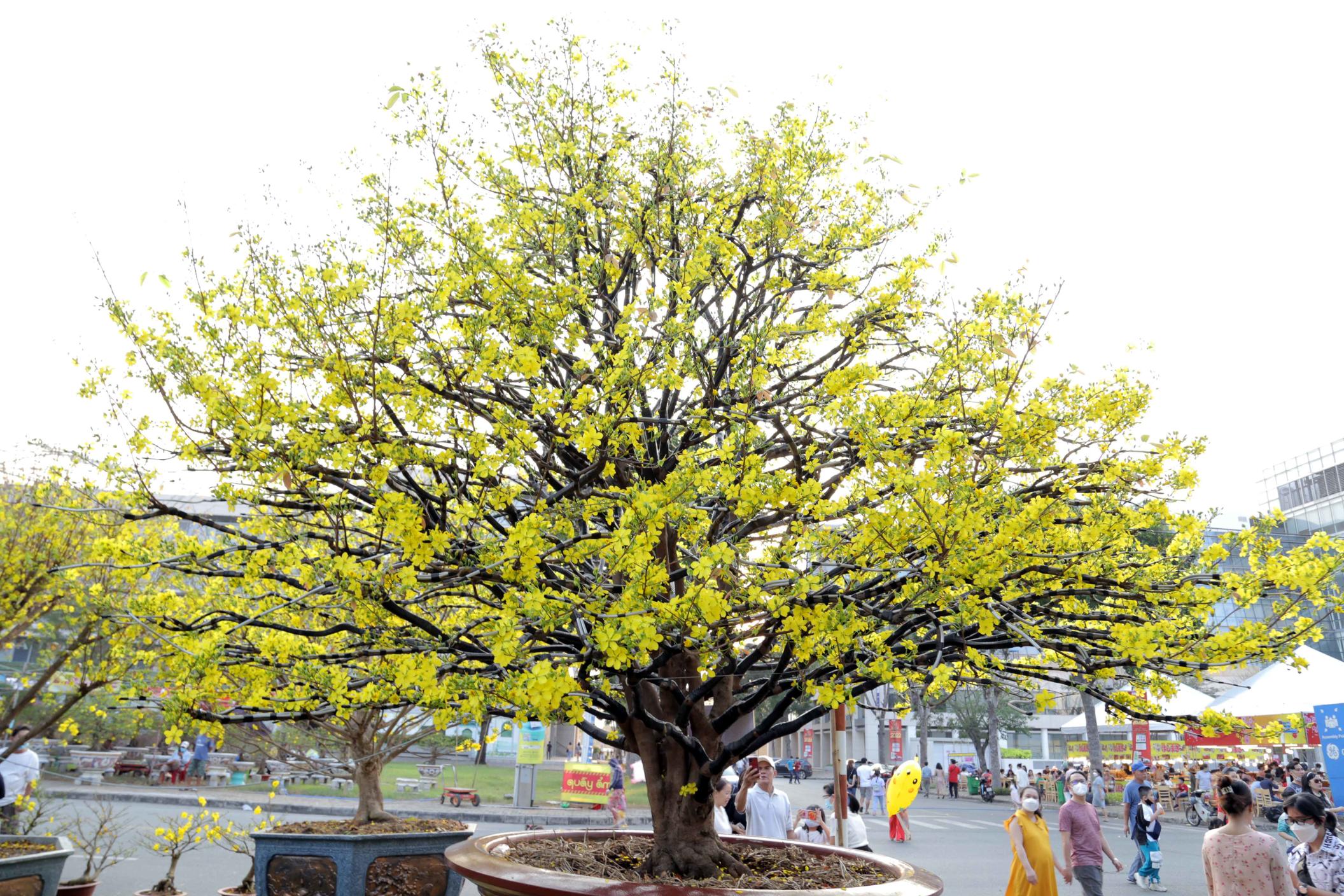 Khách tham quan chợ hoa đặc biệt ấn tượng với “lão” mai cao hơn 5m của chủ vườn Phúc Gia. Cây mai này được chào bán với giá 4 tỷ đồng.