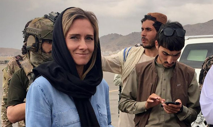 Charlotte Bellis (áo xanh, bên trái) và các thành viên Taliban tại thủ đô Kabul, Afghanistan hồi tháng 9/2021. Ảnh:Instagram/charlottebellis.