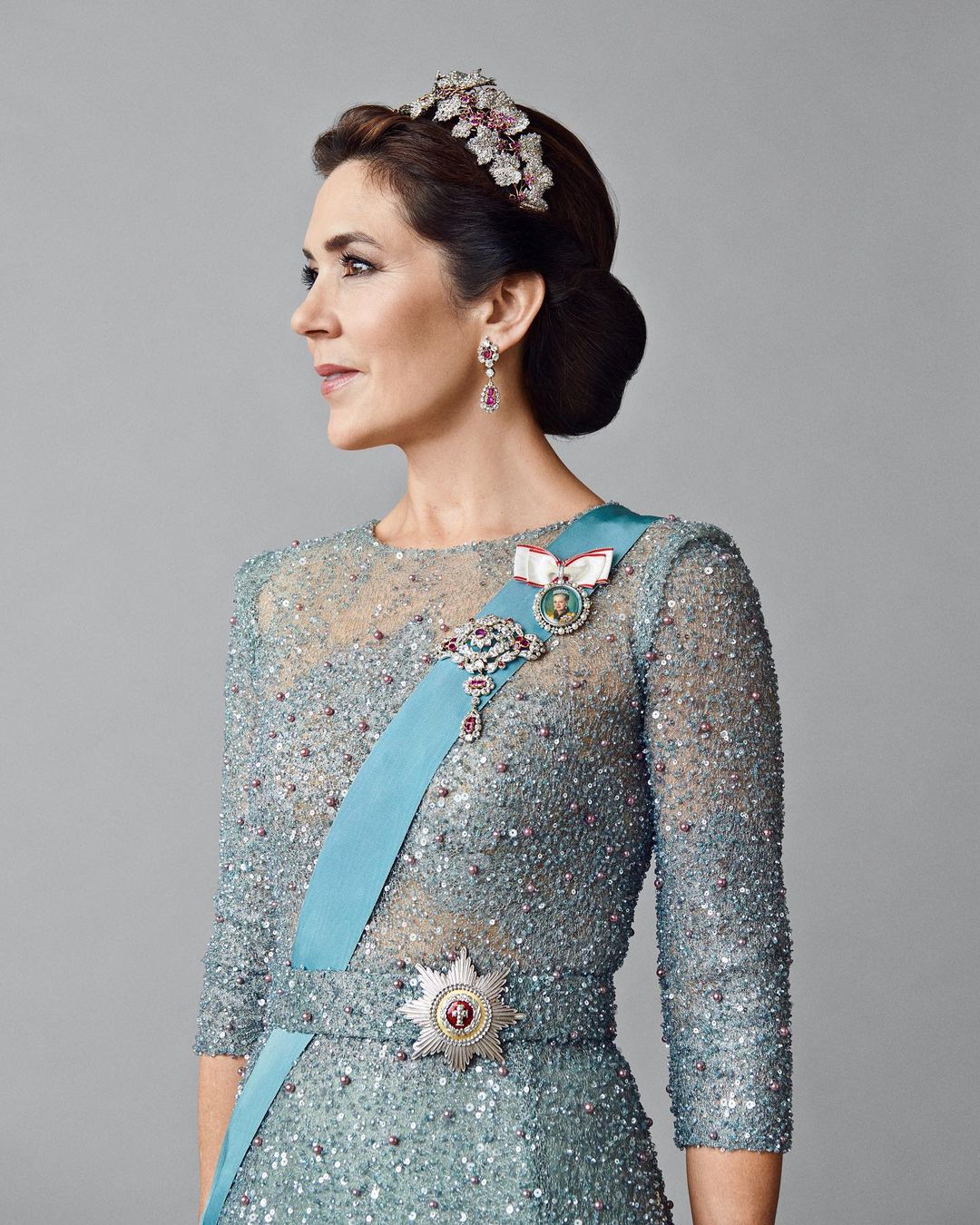 Bộ ảnh cho thấy, Công nương Mary mặc trang phục dạ tiệc màu xanh ngọc bích, đầu đội vương miện Ruby Parure Tiara, đi kèm là bộ trang sức lấp lánh bằng hồng ngọc và kim cương. Trong đó, có bức ảnh bà sánh đôi bên chồng, Thái tử Đan Mạch, người bảnh bao lịch lãm trong bộ quân phục truyền thống.