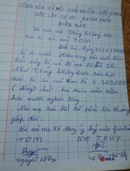 Biên bản mà bé trai này tự viết có nội dung như sau: "Lý do viết: Hôm nay tôi viết biên bản này là vì để mẹ là L.T.N.T không được tiêu hết tiền lì xì của con là 2.520.000 (đồng), chữ: hai triệu năm trăm hai mươi nghìn đồng. Nếu mẹ tiêu hết sẽ phải bồi thường gấp đôi"