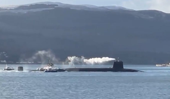 Đây là bức ảnh chụp một tàu ngầm hạt nhân Anh đang nổi trên mặt nước, nhưng điều kỳ quặc là đám khói bốc lên phía trên con tàu. Hình ảnh này làm gợi nhớ tới những đám khói gắn liền với tàu sân bay Admiral Kuznetsov của Nga mỗi khi nó xuất hiện.