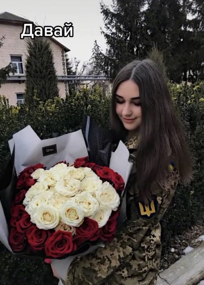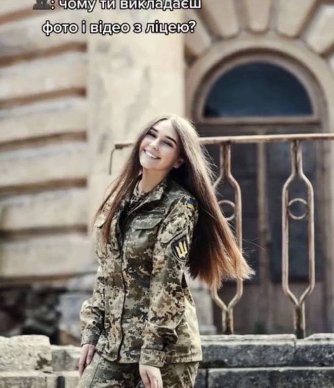 Iryna Greytsarovska, một nữ binh sĩ Ukraine mô tả trên trang Tiktok cá nhân: “Ukraine trên hết”. Cô chia sẻ nhiều video quay cảnh mình hát, nhảy múa trong bộ quân phục.
