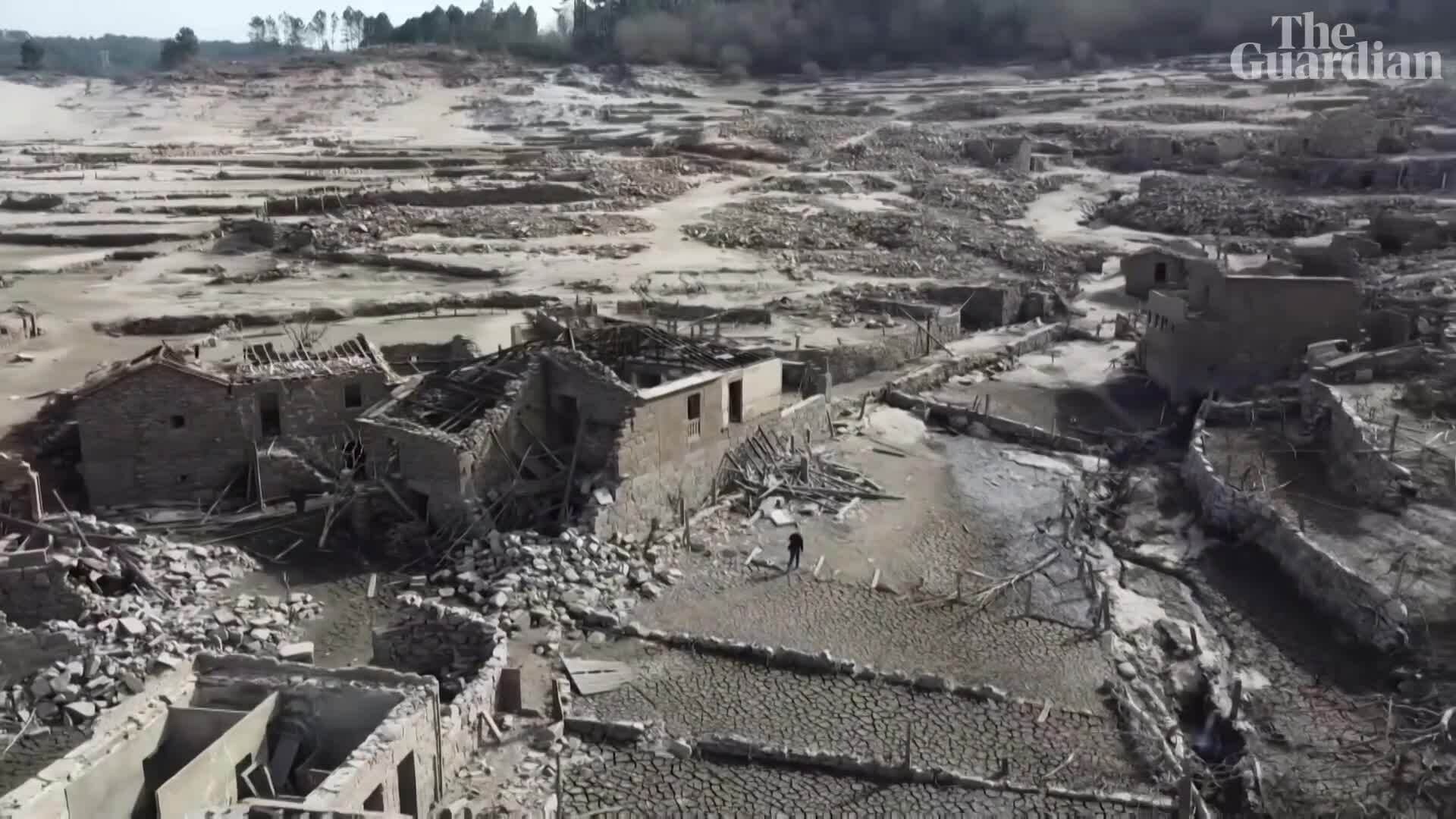 Do tình trạng hạn hán khiến hồ chứa Alto Lindoso chỉ còn 15% dung tích nước, khiến những gì còn sót lại của ngôi làng Aceredo ở vùng Galicia, phía tây bắc Tây Ban Nha hiện ra trong video được máy bay không người lái quay tuần này.