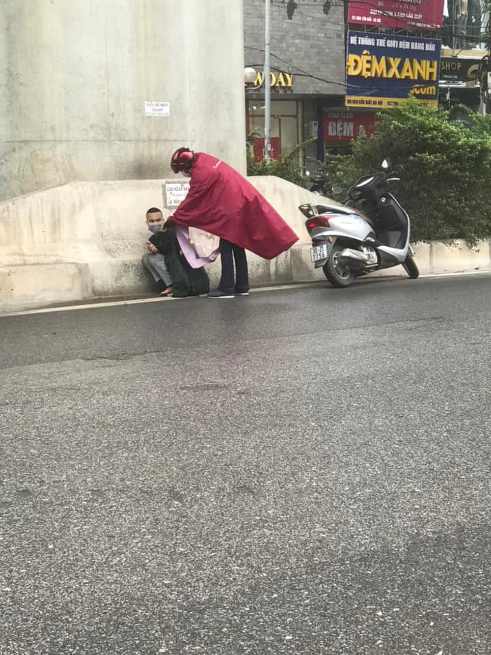 Em không kịp chụp bác xe máy lấy áo mưa ra khoác lên người cậu em kia, cậu em có vấn đề về nhận thức nên chắc mới vậy, ngồi co ro giữa đường ở Cầu Giấy! Bác xe máy trước khi đi còn dúi 1 ít tiền cho cậu em".