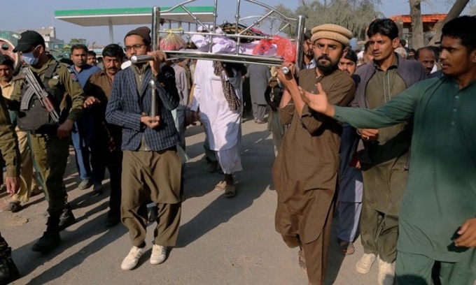 Người thân khiêng thi thể của Mushtaq Ahmed, 41 tuổi, sau khi anh bị ném đá đến chết với cáo buộc báng bổ kinh Koran ở làng Tulamba, tỉnh Punjab, phía đông Pakistan. Ảnh: AP.
