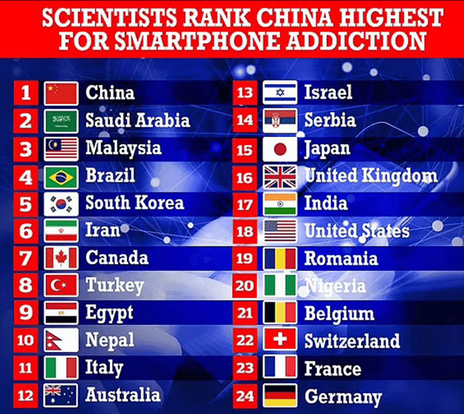 Mới đây, các nhà nghiên cứu tại Đại học McGill, Canada đã đưa ra một nghiên cứu về việc sử dụng smartphone của người dùng trên thế giới từ năm 2014 đến 2020.Trong đó, người dùng Trung Quốc đứng đầu về mức độ nghiện điện thoại di động. Bài báo nghiên cứu đã được xuất bản trên tạp chí Computers in Human Behavior. Đánh giá từ các kết quả nghiên cứu được công bố, Trung Quốc, Ả Rập Xê-út và Malaysia là ba quốc gia đứng đầu. Canada đứng thứ bảy, Nhật Bản đứng thứ 15, Mỹ đứng thứ 18 và Đức đứng thứ 24. Chỉ có hai quốc gia từ châu Phi lọt vào danh sách những quốc gia có công dân nghiện smartphone nhất là Ai Cập (9) và Nigeria (20).Theo bài báo, đối tượng của nghiên cứu này là thanh niên, với độ tuổi trung bình là 28,8 tuổi. Hơn nữa, 60% người tham gia nghiên cứu là phụ nữ. Từ năm 2014 đến năm 2020, vấn đề của người dùng smartphone trên toàn thế giới ngày càng trở nên nghiêm trọng và xu hướng này sẽ không kết thúc sớm.
