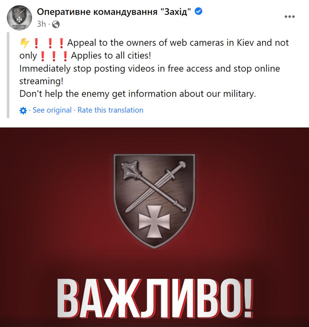 Mới đây, tài khoản Twitter của Bộ Quốc phòng Ukraine đã chia sẻ lại lời cảnh báo của Bộ Chỉ huy Tác chiến Phía Tây của nước này, kêu gọi "tất cả những người sở hữu webcam ở Kiev và tất cả các thành phố khác của Ukraine hãy ngừng ngay việc đăng tải video miễn phí trên mạng, ngừng phát sóng trực tiếp (livestream)".