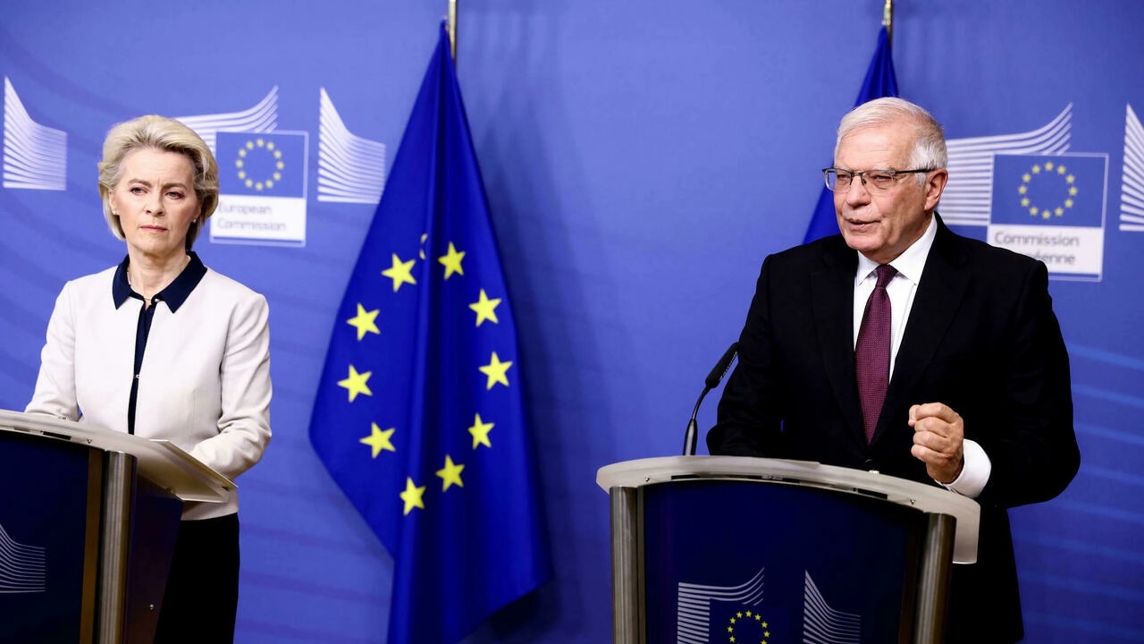 Lănh đạo ngoại giao châu Âu Josep Borrell (P) và chủ tịch Ủy Ban Châu Âu Ursula von der Leyen phát biểu với báo giới về hồ sơ Ukraina, từ Bruxelles, ngày 24/02/2022. © AP/Pool AFP