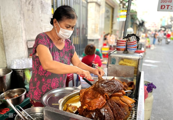 Bà Nguyễn Thị Oanh, 60 tuổi, chủ quán, chia sẻ nghề phá lấu bà học được từ mẹ, đến nay đã bán được hơn 20 năm. "Hồi trước khu này chưa có nhiều người bán phá lấu, tôi bán từ thời còn 2.000 đồng/chén cho học sinh, sinh viên. Tới nay lên giá 30.000 đồng/chén và vẫn có nhiều người ghé ăn tìm hương vị xưa", bà Oanh nói.