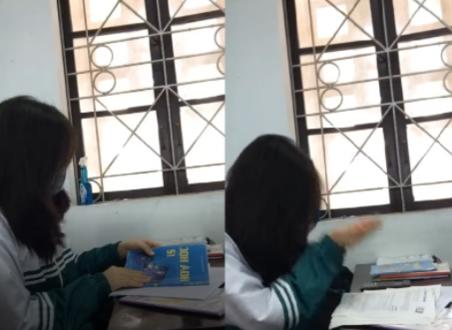 Cụ thể trong đoạn video, nữ sinh đang ngồi trong lớp ôn bài. Trước mặt nữ sinh là cuốn sách giáo khoa môn Hóa học lớp 12. Có lẽ vì quá chán nản cái cảnh học mãi không thuộc bài, cô nàng đã thực hiện một hành động khiến không ít người cười bò.