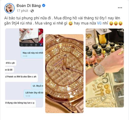 Cô chia sẻ thêm rằng: "Ai bảo tôi phung phí nữa đi. Mua đồng hồ vài tháng từ 6,1 tỷ nay lên gần 9,4 rồi nhé. Mua vàng xi nhê gì, hay mua nữa Vũ (Nguyễn Quốc Vũ - ông xã Đoàn Di Băng) nhỉ!".