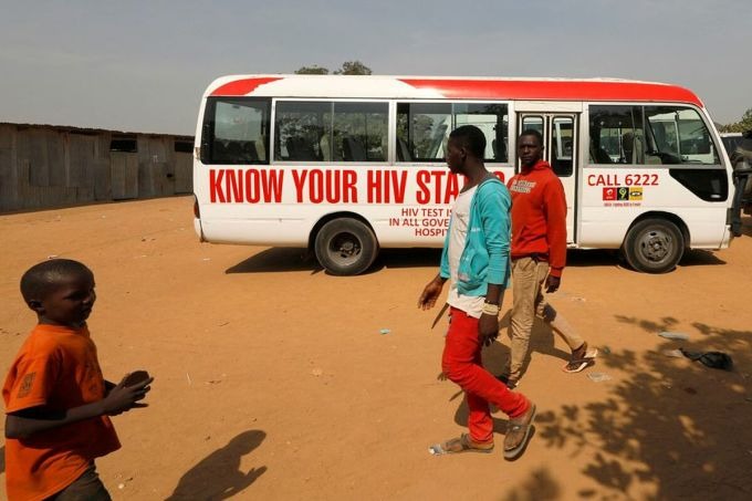 Người dân trước xe bus của chiến dịch nâng cao nhận thức về HIV/AIDS ở Abuja, Nigeria, tháng 12/2018. Ảnh: Reuters