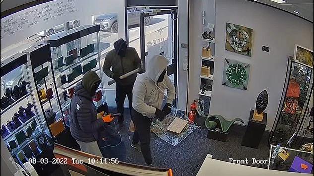Ba tên cướp có trang bị dao và gậy bóng chày đập cửa xông vào cửa hàng ngay giữa ban ngày khiến nhân viên khiếp sợ. Chúng nhanh chóng khống đập vỡ các tủ kính trưng bày những mẫu đồng hồ thiết kế cao cấp có giá trị lớn rồi bỏ hết vào ba lô.
