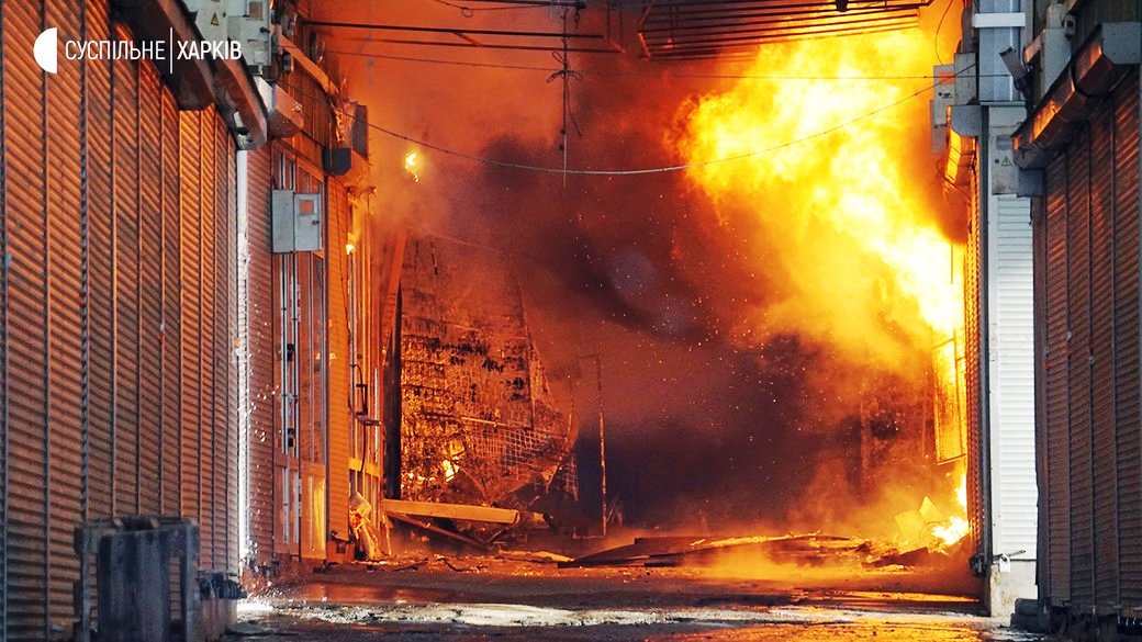 Một tiệm bị cháy dữ dội trong chợ Barabashovo. (Suspilne Kharkiv/ Twitter)