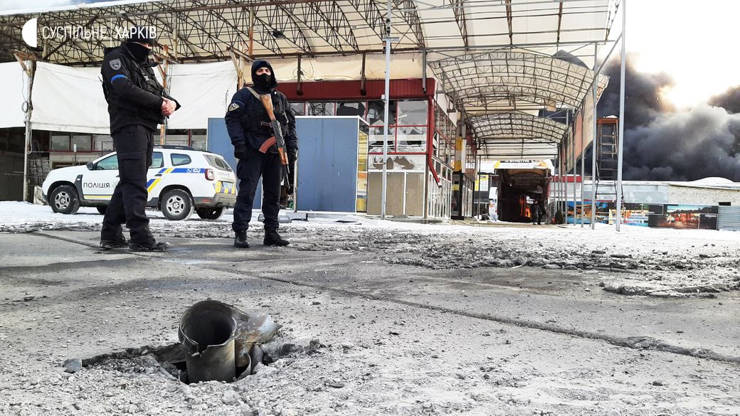 Một trái đạn đâm xuống mặt đất bên ngoài chợ Barabashovo. (Suspilne Kharkiv/ Twitter)