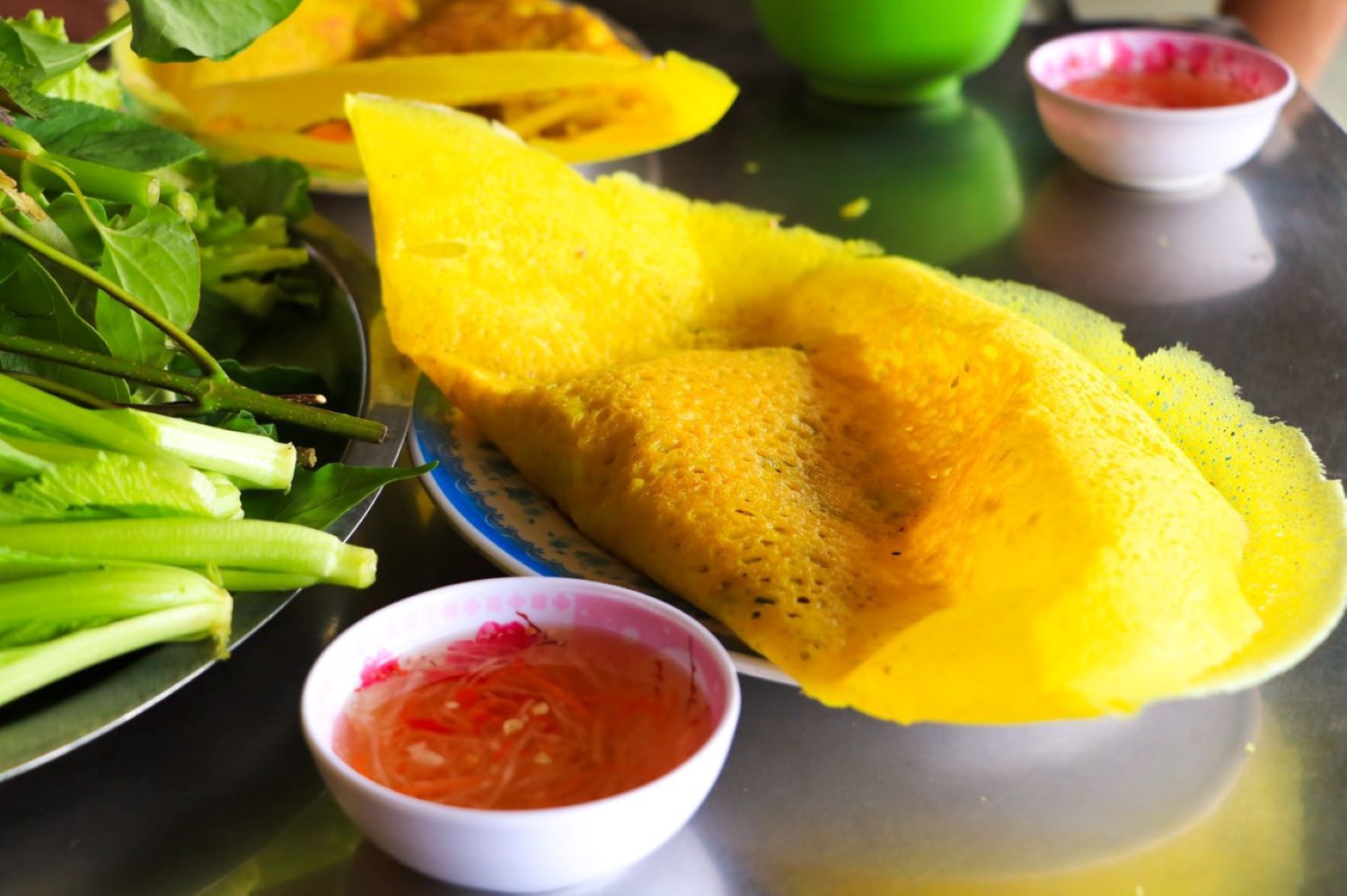 Bánh xèo Nam bộ với nhân củ hủ dừa, thịt vịt đầy hấp dẫn khi ăn kèm với rau vườn